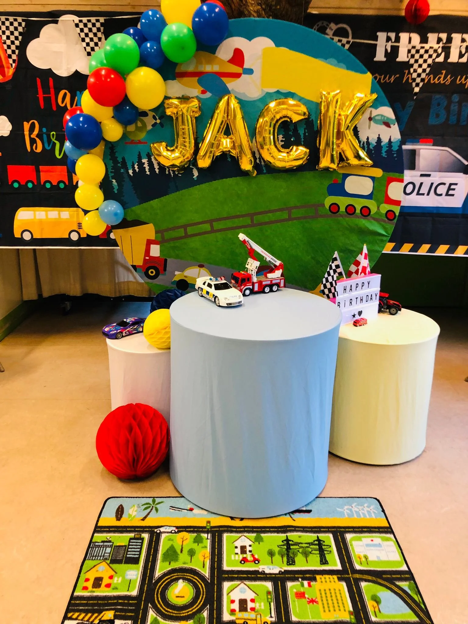 ‘Transport’ backdrop, mini balloon garland, and name on backdrop